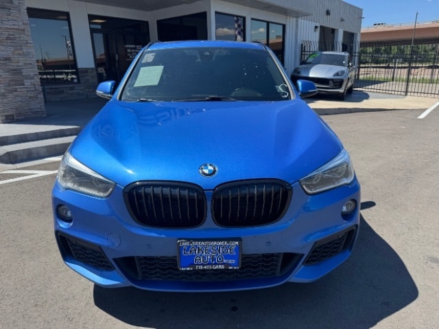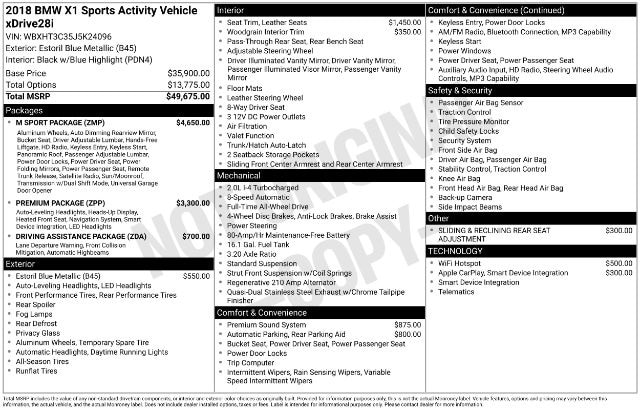 Estoril Blue Metallic 2018 BMW X1 xDrive28i AWD 8-Speed Automatic 2.0L 4-Cylinder DOHC 16V TwinPower Turbo ABS brakes, Active Driving Assistant, Advanced Real-Time Traffic Information, Aerodynamic Kit, Alum Hexagon Trim w/Estoril Blue Matte Highlight, Ambient Lighting, Apple CarPlay Compatibility, Auto-Dimming Interior & Driver Exterior Mirrors, Auto-Dimming Rear-View Mirror, Automatic temperature control, Comfort Access Keyless Entry, Driving Assistance Package, DVD Area Coding (North America), Electronic Stability Control, Emergency communication system: BMW Assist eCall, Exterior Parking Camera Rear, Front dual zone A/C, Front fog lights, harman/kardon® Logic 7® Digital Surround, Head-Up Display, Heated door mirrors, Heated Front Seats, Heated Steering Wheel, Hi-Fi Sound System, High-Gloss Roof Rails, In-Dash CD Player, LED Headlights w/Cornering Lights, Low tire pressure warning, Lumbar Support, M Sport Package, M Steering Wheel, Memory seat, Navigation System, Navigation w/Touchpad Controller, Outside temperature display, Panic alarm, Panoramic Moonroof, Park Distance Control, Parking Assistant, Power driver seat, Power Liftgate, Power passenger seat, Power windows, Power-Folding Mirrors, Premium Package, Radio: Professional w/Bluetooth/USB, Rear window defroster, Rear window wiper, Remote keyless entry, Remote Services, Roof rack: rails only, Security system, SensaTec Upholstery, Shadowline Exterior Trim, SiriusXM Satellite Radio, Sliding & Reclining Rear Seat Adjustment, Speed control, Speed-sensing steering, Speed-Sensitive Wipers, Split folding rear seat, Sport Seats, Standard Suspension, Steering wheel mounted audio controls, Tachometer, Telescoping steering wheel, Tilt steering wheel, Traction control, Turn signal indicator mirrors, Universal Garage-Door Opener, Variably intermittent wipers, Wheels: 18" x 7.5" Double-Spoke, Wheels: 18" x 7.5" Double-Spoke Bi-Color, WiFi Hotspot, Wireless Charging, Without Lines Designation Outside.