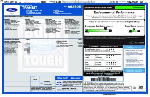 Oxford White 2023 Ford Transit-350 XLT RWD 10-Speed Automatic with Overdrive EcoBoost 3.5L V6 GTDi DOHC 24V Twin Turbocharged 3.73 Axle Ratio, 3rd row seats: split-bench, 4th-Row Bench Seat, ABS brakes, Auto High-beam Headlights, Auto Start-Stop Delete, Cloth Front Bucket Seats, Electronic Air Temperature Control, Electronic Stability Control, Front Fog Lamps, Front Sensing System, Fully automatic headlights, Low tire pressure warning, Order Code 302A, Panic alarm, Power door mirrors, Power Running Boards (DISC), Power windows, Privacy Glass, Radio: AM/FM Stereo w/SYNC 4/SiriusXM w/360L/Nav, Rear air conditioning, Rear window defroster, Remote keyless entry, Remote Start, Reverse Sensing System, Side Sensing System, Steering wheel mounted audio controls, Telescoping steering wheel, Tilt steering wheel, Traction control, Variably intermittent wipers, Wheels: 16" Steel w/Full Silver Cover.