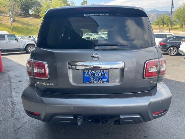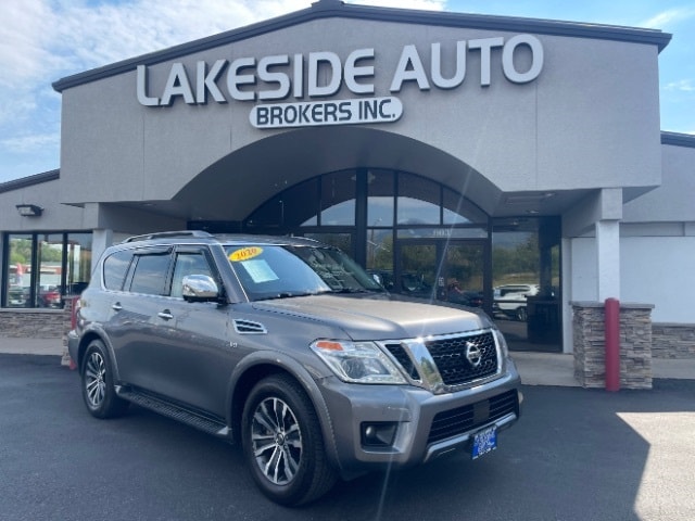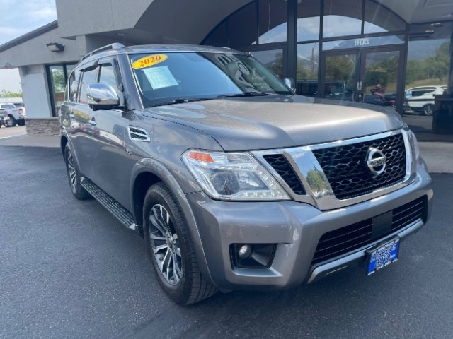 Gun Metallic 2020 Nissan Armada SL 4WD 7-Speed Automatic 5.6L V8 4WD, 13 Speakers, 20" Painted Alloy Wheels, 2nd Row Captain's Chairs, 2nd Row Center Console w/Padded Armrest, 3rd row seats: split-bench, Towing Package, ABS brakes, Auto tilt-away steering wheel, Auto-leveling suspension, Automatic temperature control, Axle Ratio: 2.94, Blind Spot Warning, Brake assist, Captain's Chairs Package, Electronic Stability Control, Emergency communication system: NissanConnect Services, Exterior Parking Camera Rear, Front dual zone A/C, Front fog lights, Fully automatic headlights, Garage door transmitter: HomeLink, Heated door mirrors, Heated Front Bucket Seats w/Power Driver's Memory, Heated front seats, Intelligent Back-Up Intervention (I-BI), Intelligent Distance Control (I-DC), Leather-Appointed Seat Trim, Low tire pressure warning, Memory seat, Navigation System, Outside temperature display, Panic alarm, Power door mirrors, Power driver seat, Power Liftgate, Power passenger seat, Power Sliding Moonroof w/Front Tilt & Rear Slide, Power windows, Premium Package, Radio: AM/FM/SXM/CD/MP3/HD, Rain sensing wipers, Rear air conditioning, Rear Cross Traffic Alert (RCTA), Rear window defroster, Rear window wiper, Reclining 3rd row seat, Remote keyless entry, Security system, Speed control, Spoiler, Steering wheel memory, Steering wheel mounted audio controls, Tachometer, Telescoping steering wheel, Tilt steering wheel, Traction control, Trip computer, Turn signal indicator mirrors, Variably intermittent wipers.