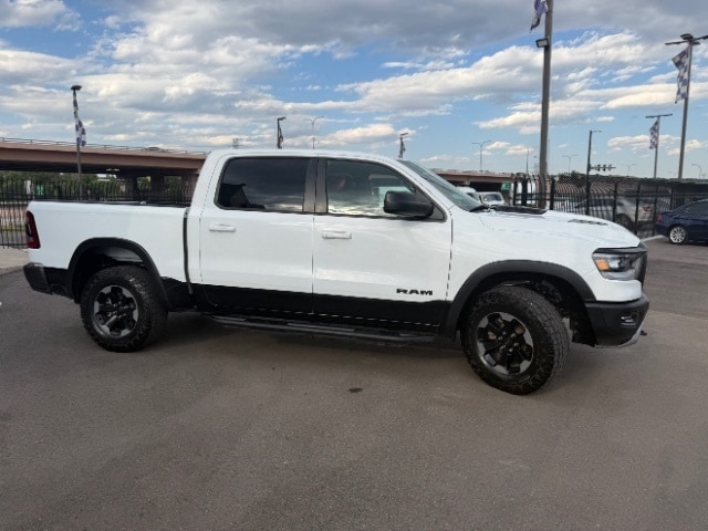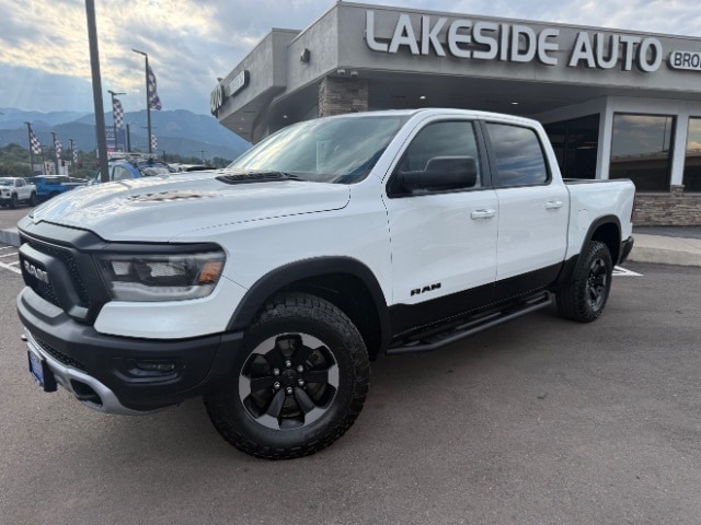 Bright White Clearcoat 2019 Ram 1500 Rebel 4WD 8-Speed Automatic HEMI 5.7L V8 Multi Displacement VVT Power Sliding Rear Window, Performance Tuned Shocks, Sport Performance Hood, Skid Plates, Tow Package, 3.92 Rear Axle Ratio, 48V Belt Starter Generator, ABS brakes, Air Conditioning, AM/FM radio: SiriusXM, Black Tubular Side Steps, Brake assist, Compass, Front Bucket Seats, Front fog lights, Fully automatic headlights, Heated door mirrors, Low tire pressure warning, Outside temperature display, Panic alarm, ParkView Rear Back-Up Camera, Power door mirrors, Power driver seat, Power windows, Quick Order Package 25W Rebel, Radio: Uconnect 3 w/5" Display, Rear step bumper, Remote keyless entry, Speed control, Split folding rear seat, Spray In Bedliner, Steering wheel mounted audio controls, Tachometer, Telescoping steering wheel, Tilt steering wheel, Trip computer, Variably intermittent wipers, Voltmeter, Wheels: 18" x 8" Painted Black.